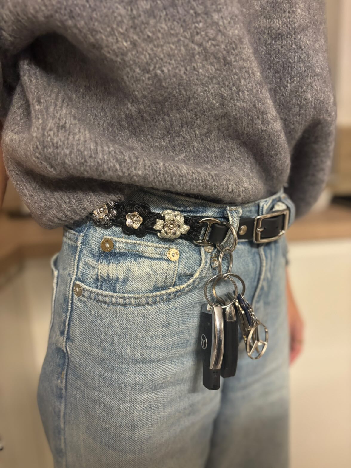 La Ceinture Flowers est une ceinture tressée à la main, ornée de fleurs métalliques élégantes qui ajoutent une touche unique à votre tenue. Solide, confortable et stylée, elle se porte aussi bien avec un jean qu’avec une tenue plus habillée. Son anneau latéral permet d’accrocher facilement vos clés ou accessoires.